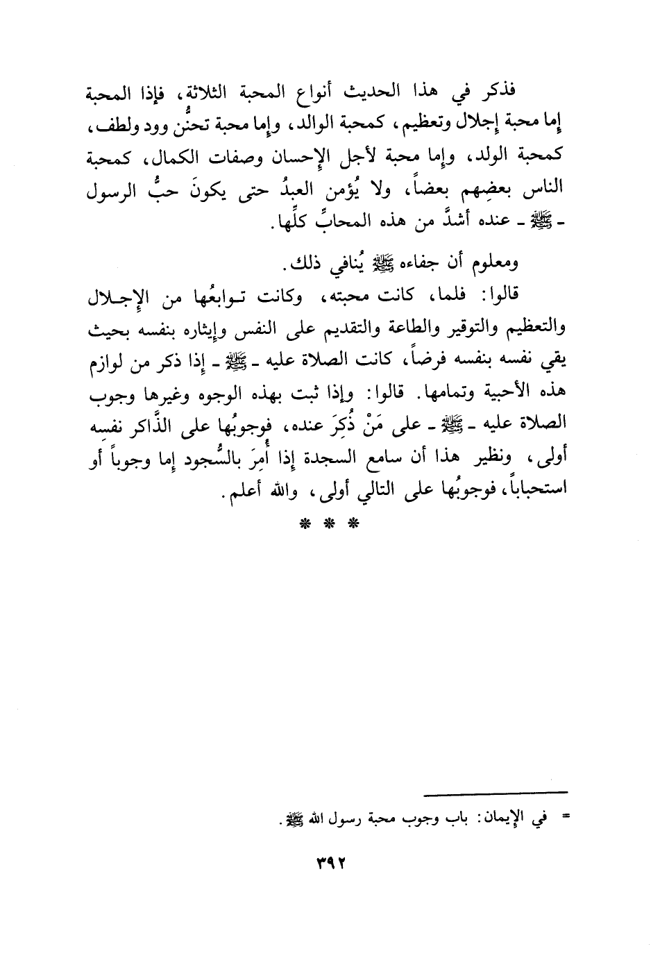 فَذكر فِي هَذَا الحَدِيث أَنْوَاع الْمحبَّة الثَّلَاثَة فَإِذا الْمحبَّة إِمَّا محبَّة إجلال وتعظيم كمحبة الْوَالِد وَإِمَّا محبَّة تَحَنن وود ولطف كمحبة الْوَلَد وَإِمَّا محبَّة لأجل الْإِحْسَان وصفات الْكَمَال كمحبة النَّاس بَعضهم بَعْضًا وَلَا يُؤمن العَبْد حَتَّى يكون حب الرَّسُول صلى الله عَلَيْهِ وَسلم عِنْده أَشد من هَذِه المحاب كلهَا