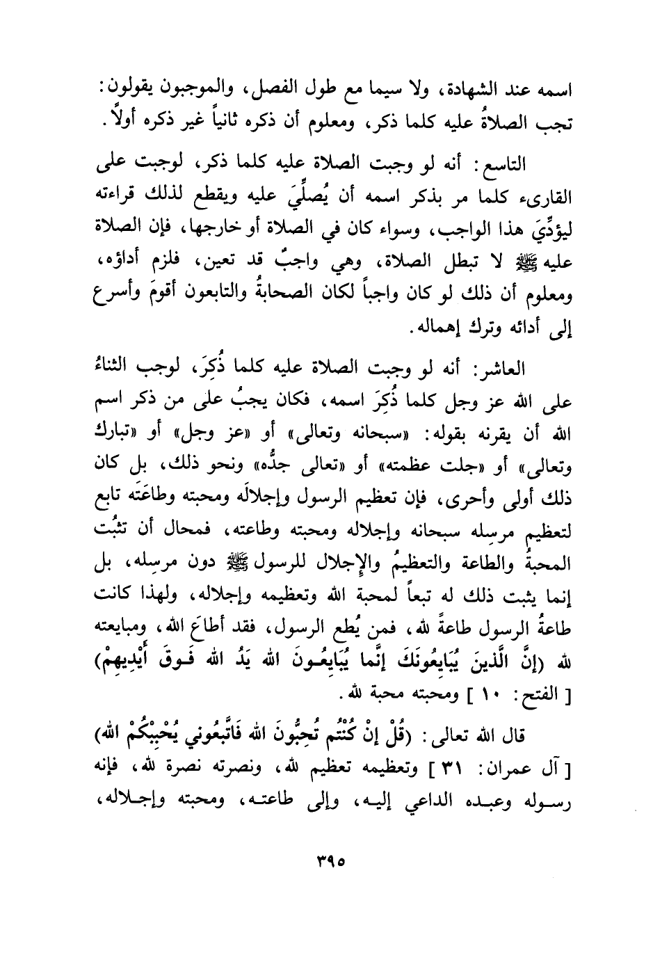 الْعَاشِر أَنه لَو وَجَبت الصَّلَاة عَلَيْهِ كلما ذكر لوَجَبَ الثَّنَاء على الله عز وَجل كلما ذكر اسْمه فَكَانَ يجب على من ذكر اسْم الله أَن يقرنه بقوله سُبْحَانَهُ وَتَعَالَى أَو عز وَجل أَو تبَارك وَتَعَالَى أَو جلت عَظمته أَو تَعَالَى جده وَنَحْو ذَلِك بل كَانَ ذَلِك اولى واحرى فَإِن تَعْظِيم الرَّسُول وإجلاله ومحبته وطاعته تَابع لتعظيم مرسله سُبْحَانَهُ اجلاله ومحبته وطاعته فمحال أَن تثبت الْمحبَّة وَالطَّاعَة والتعظيم والإجلال للرسول صلى الله عَلَيْهِ وَسلم دون مرسله بل إِنَّمَا يثبت ذَلِك لَهُ تبعا لمحبة الله وتعظيمه وإجلاله وَلِهَذَا كَانَت طَاعَة الرَّسُول طَاعَة لله فَمن يطع الرَّسُول فقد أطَاع الله ومبايعته لله {إِنَّ الَّذِينَ يُبَايِعُونَكَ إِنَّمَا يُبَايِعُونَ اللَّهَ يَدُ اللَّهِ فَوْقَ أَيْدِيهِمْ} الْفَتْح 10 ومحبته محبَّة لله