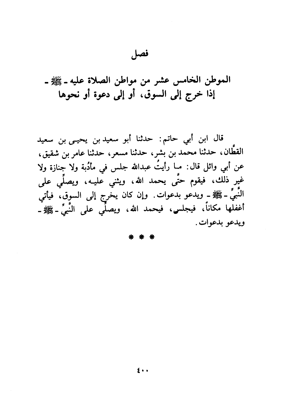 قَالَ ابْن أبي حَاتِم حَدثنَا أَبُو سعيد بن يحيى بن سعيد الْقطَّان حَدثنَا مُحَمَّد بن بشر حَدثنَا مسعر حَدثنَا عَامر بن شَقِيق عَن أبي وَائِل قَالَ مَا رَأَيْت عبد الله جلس فِي مأدبة وَلَا جَنَازَة وَلَا غير ذَلِك فَيقوم حَتَّى يحمد الله ويثني عَلَيْهِ وَيُصلي على النَّبِي صلى الله عَلَيْهِ وَسلم وَيَدْعُو بدعوات وَإِن كَانَ يخرج إِلَى السُّوق فَيَأْتِي أغفلها مَكَانا فيجلس فيحمد الله وَيُصلي على النَّبِي صلى الله عَلَيْهِ وَسلم وَيَدْعُو بدعوات