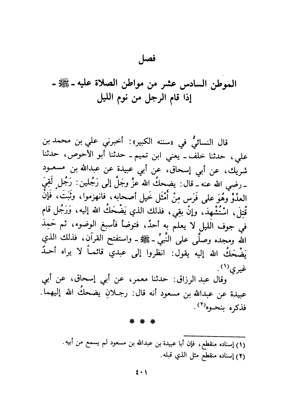 قَالَ النَّسَائِيّ فِي سنَنه الْكَبِير أَخْبرنِي عَليّ بن مُحَمَّد بن عَليّ حَدثنَا خلف يَعْنِي ابْن تَمِيم حَدثنَا أَبُو الْأَحْوَص حَدثنَا شريك عَن أبي إِسْحَاق عَن أبي عُبَيْدَة عِنْد عبد الله بن مَسْعُود رَضِي الله عَنهُ قَالَ يضْحك الله عز وَجل إِلَى رجلَيْنِ رجل لَقِي الْعَدو وَهُوَ على فرس من أمثل خيل أَصْحَابه فَانْهَزَمُوا وَثَبت فَإِن قتل اسْتشْهد وَإِن بَقِي فَذَلِك الَّذِي يضْحك الله إِلَيْهِ وَرجل قَامَ فِي جَوف اللَّيْل لَا يعلم بِهِ أحد فَتَوَضَّأ فأسبغ الْوضُوء ثمَّ حمد الله ومجده وَصلى على النَّبِي صلى الله عَلَيْهِ وَسلم واستفتح الْقُرْآن فَذَلِك الَّذِي يضْحك الله إِلَيْهِ يَقُول انْظُرُوا إِلَى عَبدِي قَائِما لَا يرَاهُ أحد غَيْرِي