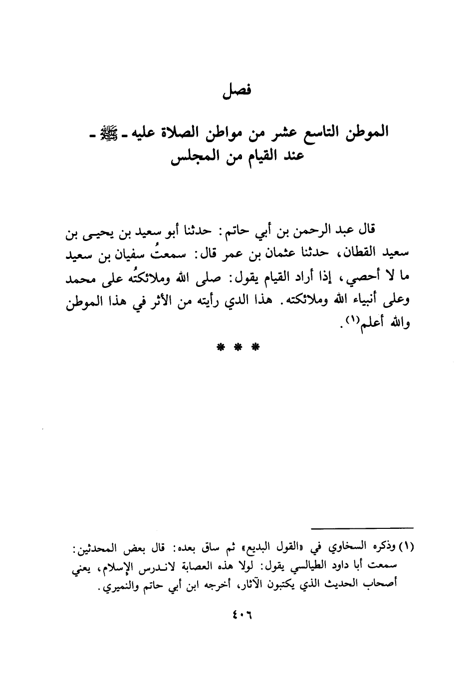 قَالَ عبد الرَّحْمَن بن أبي حَاتِم حَدثنَا أَبُو سعيد بن يحيى بن سعيد الْقطَّان حَدثنَا عُثْمَان بن عمر قَالَ سَمِعت سُفْيَان بن سعيد مَا لَا أحصي إِذا أَرَادَ الْقيام يَقُول صلى الله وَمَلَائِكَته على مُحَمَّد وعَلى أَنْبيَاء الله وَمَلَائِكَته هَذَا الدي رَأَيْته من الْأَثر فِي هَذَا الموطن وَالله أعلم