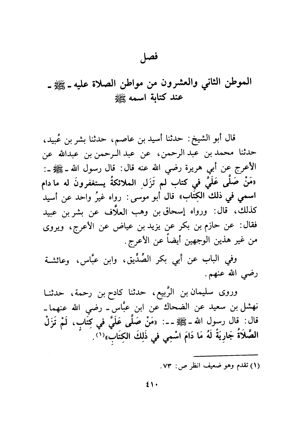 قَالَ أَبُو الشَّيْخ حَدثنَا أسيد بن عَاصِم حَدثنَا بشر بن عبيد حَدثنَا مُحَمَّد بن عبد الرَّحْمَن عَن عبد الرَّحْمَن بن عبد الله عَن الْأَعْرَج عَن أبي هُرَيْرَة رَضِي الله عَنهُ قَالَ قَالَ رَسُول الله صلى الله عَلَيْهِ وَسلم نم صلى عَليّ فِي كتاب لم تزل الْمَلَائِكَة يَسْتَغْفِرُونَ لَهُ مَا دَامَ اسْمِي فِي ذَلِك الْكتاب قَالَ أَبُو مُوسَى رَوَاهُ غير وَاحِد عَن أسيد كَذَلِك قَالَ وَرَوَاهُ إِسْحَاق بن وهب العلاف عَن بشر بن عبيد فَقَالَ عَن حَازِم بن بكر عَن يزِيد بن عِيَاض عَن الْأَعْرَج ويروى من غير هذَيْن الْوَجْهَيْنِ أَيْضا عَن الْأَعْرَج