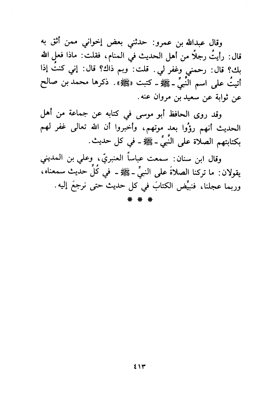 وَقَالَ عبد الله بن عَمْرو حَدثنِي بعض إخْوَانِي مِمَّن أَثِق بِهِ قَالَ رَأَيْت رجلا من أهل الحَدِيث فِي الْمَنَام فَقلت مَاذَا فعل الله بك قَالَ رحمني وَغفر لي قلت وَبِمَ ذَاك قَالَ إِنِّي كنت إِذا أتيت على اسْم النَّبِي صلى الله عَلَيْهِ وَسلم كتبت صلى الله عَلَيْهِ وَسلم ذكرهَا مُحَمَّد بن صَالح عَن ثوابة عَن سعيد بن مَرْوَان عَنهُ