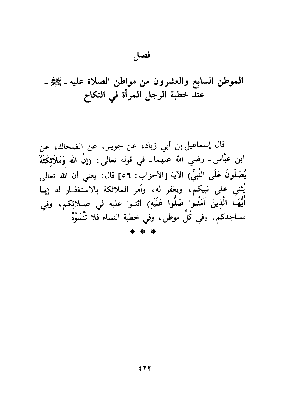 قَالَ إِسْمَاعِيل بن أبي زِيَاد عَن جُوَيْبِر عَن الضَّحَّاك عَن ابْن عَبَّاس رَضِي الله عَنْهُمَا فِي قَوْله تَعَالَى {إِن الله وَمَلَائِكَته يصلونَ على النَّبِي} الاية الْأَحْزَاب 56 قَالَ يَعْنِي أَن الله تَعَالَى يثني على نَبِيكُم وَيغْفر لَهُ وَأمر الْمَلَائِكَة بالاستغفار لَهُ {يَا أَيهَا الَّذين آمنُوا صلوا عَلَيْهِ} أثنوا عَلَيْهِ فِي صَلَاتكُمْ وَفِي مَسَاجِدكُمْ وَفِي كل موطن وَفِي خطْبَة النِّسَاء فَلَا تنسوه