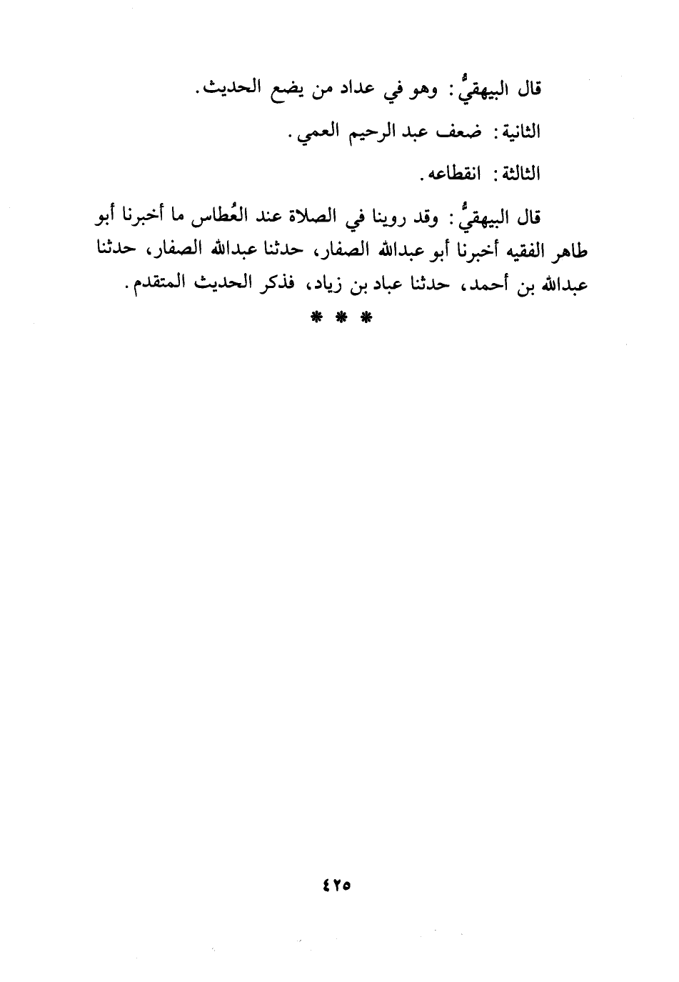 قَالَ الْبَيْهَقِيّ وَقد روينَا فِي الصَّلَاة عِنْد العطاس مَا أخبرنَا أَبُو طَاهِر الْفَقِيه أخبرنَا أَبُو عبد الله الصفار حَدثنَا عبد الله الصفار حَدثنَا عبد الله بن أَحْمد حَدثنَا عباد بن زِيَاد فَذكر الحَدِيث الْمُتَقَدّم