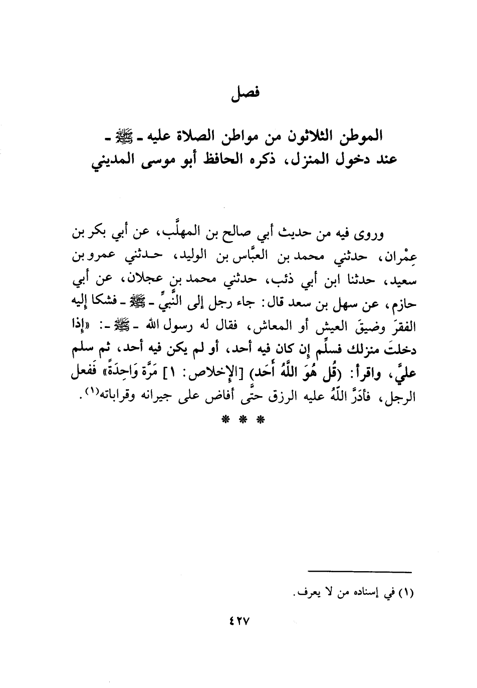الموطن الثَّلَاثُونَ من مَوَاطِن الصَّلَاة عَلَيْهِ صلى الله عَلَيْهِ وَسلم عِنْد دُخُول الْمنزل ذكره الْحَافِظ أَبُو مُوسَى الْمَدِينِيّ