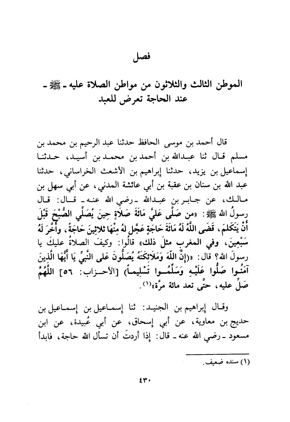 قَالَ أَحْمد بن مُوسَى الْحَافِظ حَدثنَا عبد الرَّحِيم بن مُحَمَّد بن مُسلم قَالَ ثَنَا عبد الله بن أَحْمد بن مُحَمَّد بن أسيد حَدثنَا إِسْمَاعِيل بن يزِيد حَدثنَا إِبْرَاهِيم بن الْأَشْعَث الْخُرَاسَانِي حَدثنَا عبد الله بن سِنَان بن عقبَة بن أبي عَائِشَة الْمدنِي عَن أبي سهل بن مَالك عَن جَابر بن عبد الله رَضِي الله عَنهُ قَالَ قَالَ رَسُول الله صلى الله عَلَيْهِ وَسلم من صلى على مائَة صَلَاة حِين يُصَلِّي الصُّبْح قبل أَن يتَكَلَّم قضى الله لَهُ مائَة حَاجَة عجل لَهُ مِنْهَا ثَلَاثِينَ الله حَاجَة وَأخر لَهُ سبعين وَفِي الْمغرب مثل ذَلِك قَالُوا وَكَيف الصَّلَاة عَلَيْك يَا رَسُول الله قَالَ {إِن الله وَمَلَائِكَته يصلونَ على النَّبِيِّ يَا أَيُّهَا الَّذين آمنُوا صلوا عَلَيْهِ وَسَلِّمُوا تَسْلِيماً} الْأَحْزَاب 56 اللَّهُمَّ صل عَلَيْهِ حَتَّى تعد مائَة مرّة