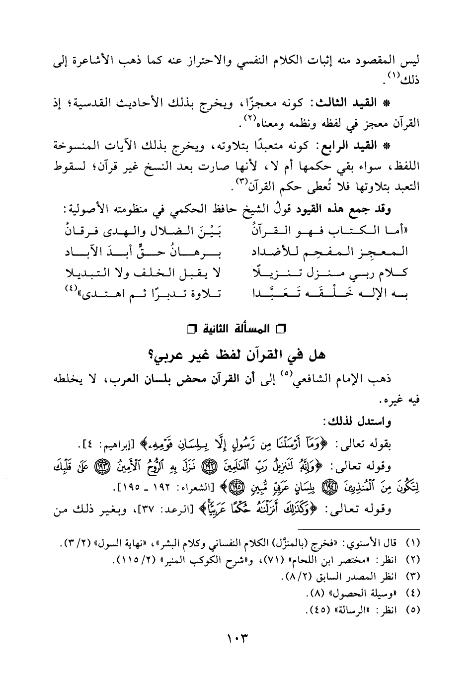(1) قال الأسنوي: "فخرج (بالمنزل) الكلام النفساني وكلام البشر"، "نهاية السول" (2/3) .