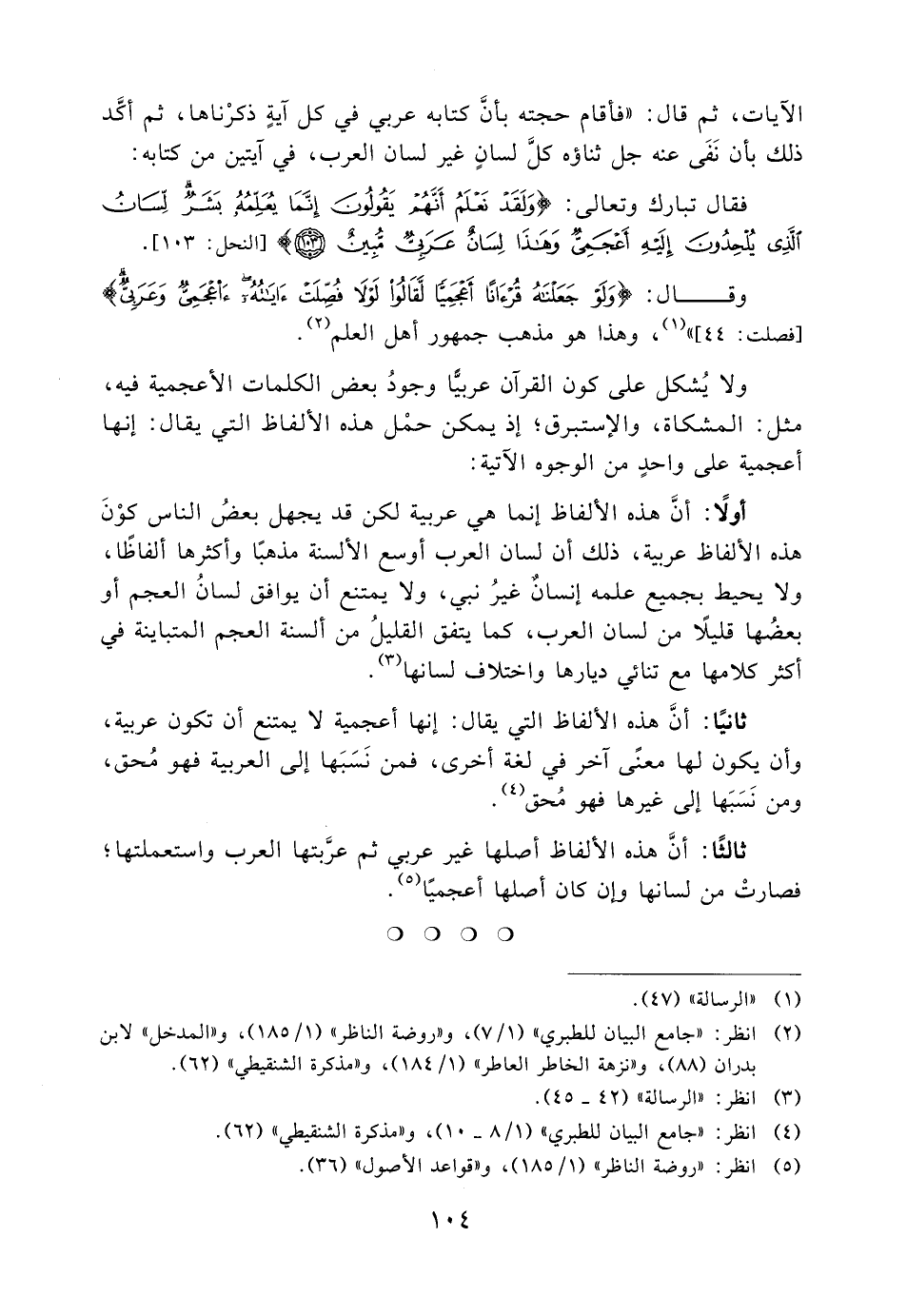 فقال تبارك وتعالى: {وَلَقَدْ نَعْلَمُ أَنَّهُمْ يَقُولُونَ إِنَّمَا يُعَلِّمُهُ بَشَرٌ لِسَانُ الَّذِي يُلْحِدُونَ إِلَيْهِ أَعْجَمِيٌّ وَهَذَا لِسَانٌ عَرَبِيٌّ مُبِينٌ} [النحل: 103] .وقال: {وَلَوْ جَعَلْنَاهُ قُرْآنًا أَعْجَمِيًّا لَقَالُوا لَوْلا فُصِّلَتْ آيَاتُهُ أَأَعْجَمِيٌّ وَعَرَبِيٌّ} [فصلت: 44] " (1) ، وهذا هو مذهب جمهور أهل العلم (2) . ولا يُشكل على كون القرآن عربيًا وجود بعض الكلمات الأعجمية فيه، مثل: المشكاة، والإستبرق؛ إذ يمكن حمل هذه الألفاظ التي يقال: إنها أعجمية على واحدٍ من الوجوه الآتية:
