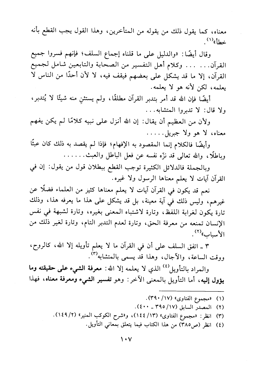 والمراد بالتأويل (4) الذي لا يعلمه إلا الله: معرفة الشيء على حقيقته وما يؤول إليه، أما التأويل بالمعنى الآخر: وهو تفسير الشيء ومعرفة معناه، فهذا مما