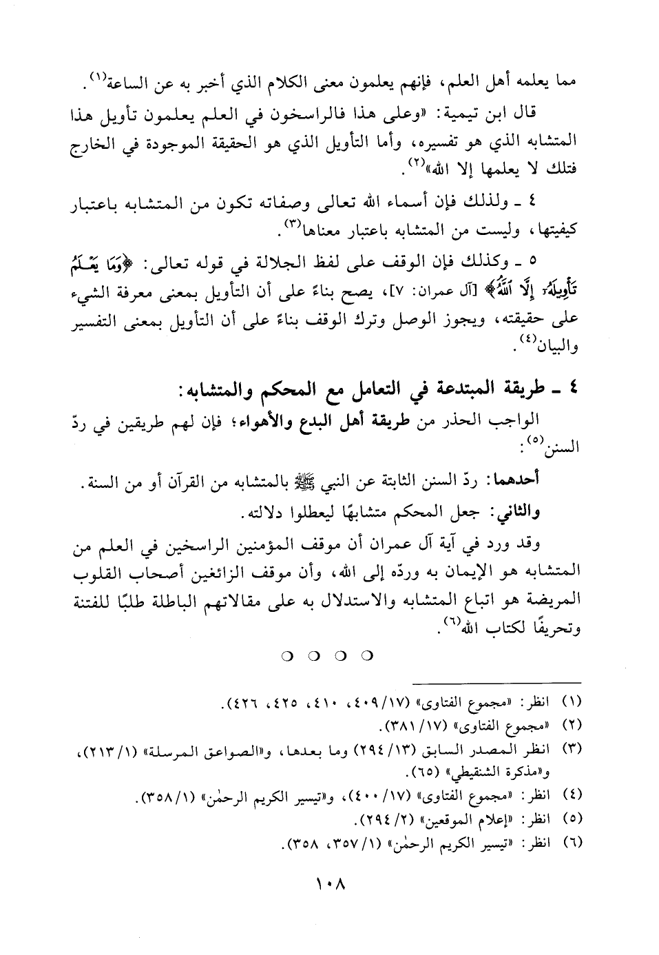 4- ولذلك فإن أسماء الله تعالى وصفاته تكون من المتشابه باعتبار كيفيتها، وليست من المتشابه باعتبار معناها (3) .