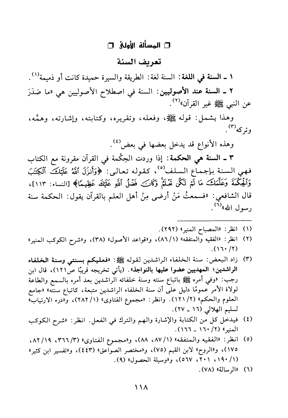 (3) زاد البعض: سنة الخلفاء الراشدين لقوله - صلى الله عليه وسلم -: «فعليكم بسنتي وسنة الخلفاء الراشدين؛ المهديين عضوا عليها بالنواجذ» . (يأتي تخريجه قريبًا) ، قال ابن رجب: "وفي أمره - صلى الله عليه وسلم - باتباع سنته وسنة خلفائه الراشدين بعد أمره بالسمع والطاعة لولاة الأمر عمومًا دليل على أن سنة الخلفاء الراشدين متبعة، كاتباع سنته" "جامع العلوم والحكم" (2/121) . وانظر: "مجموع الفتاوى" (1/282) ، و"درء الارتياب" لسليم الهلالي (16 - 27) .