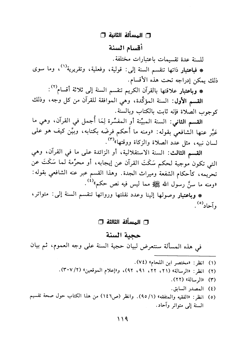 (5) انظر: "الفقيه والمتفقه" (1/95) . وانظر (ص 146) من هذا الكتاب حول صحة تقسيم السنة إلى متواتر وآحاد.