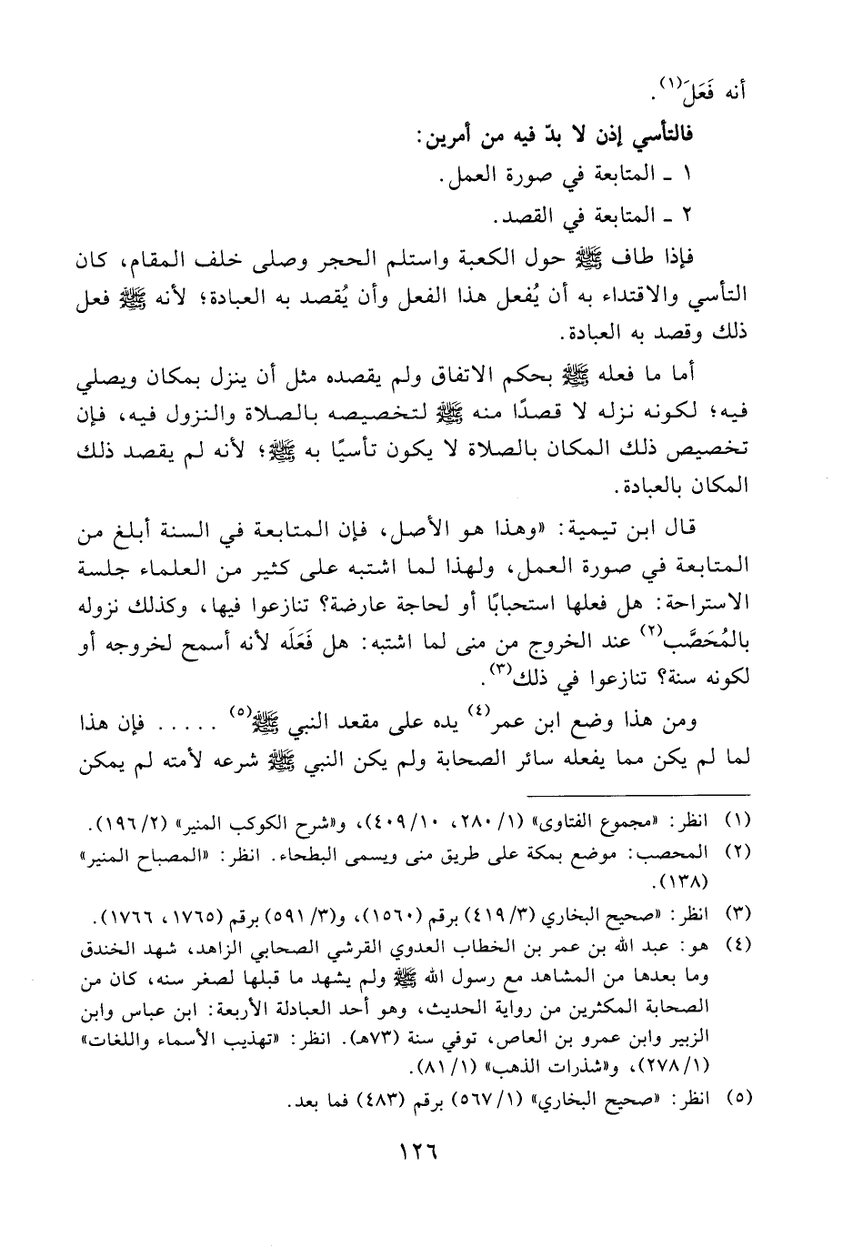 قال ابن تيمية: "وهذا هو الأصل، فإن المتابعة في السنة أبلغ من المتابعة في صورة العمل، ولهذا لما اشتبه على كثير من العلماء جلسة الاستراحة: هل فعلها استحبابًا أو لحاجة عارضة؟ تنازعوا فيها، وكذلك نزوله بالمحُصب (2) عند الخروج من منى لما اشتبه: هل فعله لأنه أسمح لخروجه أو لكونه سنة؟ تنازعوا في ذلك (3) .