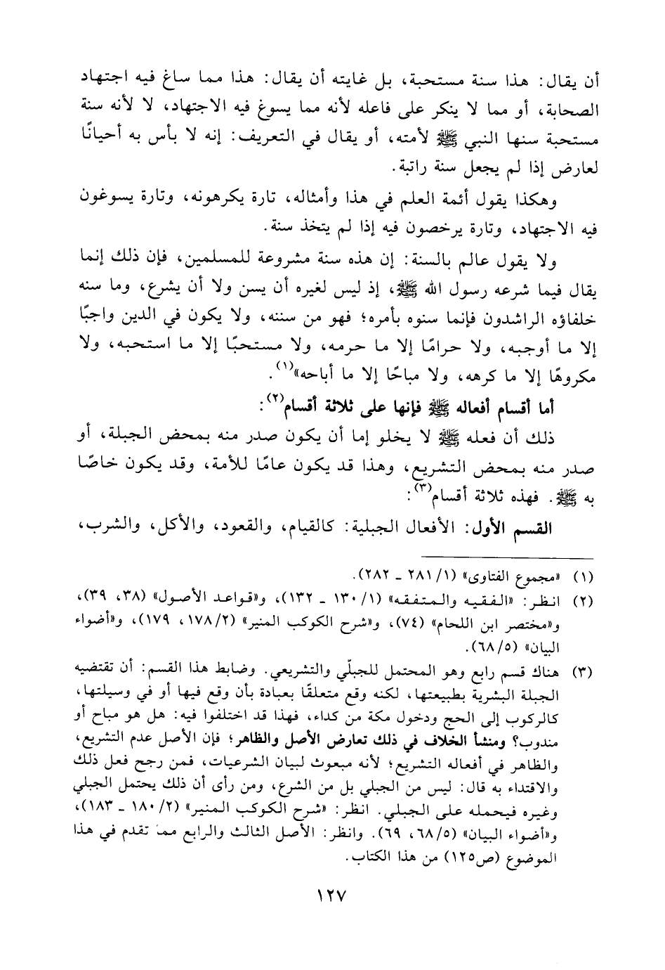 (3) هناك قسم رابع وهو المحتمل للجبلي والتشريعي. وضابط هذا القسم: أن تقتضيه الجبلة البشرية بطبيعتها، لكنه وقع متعلقًا بعبادة بأن وقع فيها أو في وسيلتها، كالركوب إلى الحج ودخول مكة من كداء، فهذا قد اختلفوا فيه: هل هو مباح أو مندوب؟ ومنشأ الخلاف في ذلك تعارض الأصل والظاهر؛ فإن الأصل عدم التشريع، والظاهر في أفعاله التشريع؛ لأنه مبعوث لبيان الشرعيات، فمن رجح فعل ذلك والاقتداء به قال: ليس من الجبلي بل من الشرع، ومن رأى أن ذلك يحتمل الجبلي وغيره فيحمله على الجبلي. انظر: "شرح الكوكب المنير" (2/180 – 183) ، و"أضواء البيان" (5/68، 69) . وانظر: الأصل الثالث والرابع مما تقدم في هذا الموضوع (ص125) من هذا الكتاب.