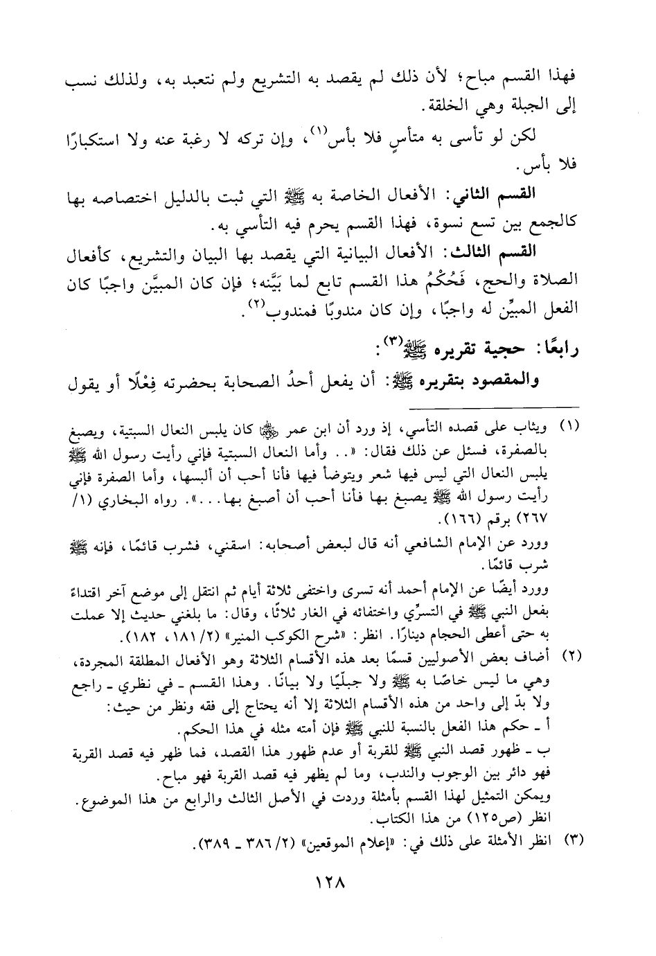 (2) أضاف بعض الأصوليين قسمًا بعد هذه الأقسام الثلاثة وهو الأفعال المطلقة المجردة، وهي ما ليس خاصًا به - صلى الله عليه وسلم - ولا جبليًا ولا بيانًا. وهذا القسم -في نظري- راجع ولا بد إلى واحد من هذه الأقسام الثلاثة إلا أنه يحتاج إلى فقه ونظر من حيث: