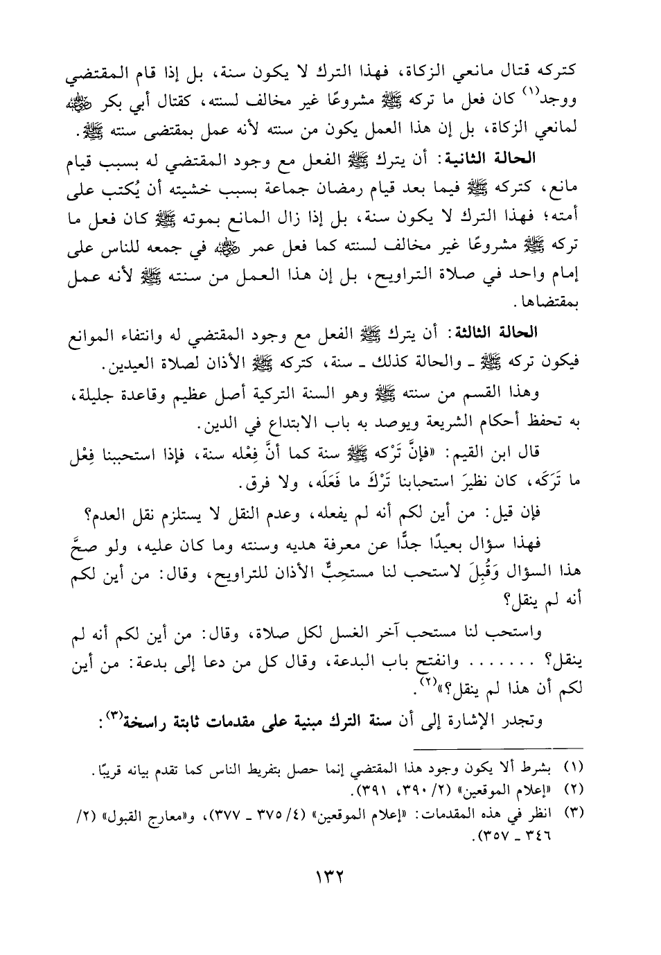 وهذا القسم من سنته - صلى الله عليه وسلم - وهو السنة التركية أصل عظيم وقاعدة جليلة، به تحفظ أحكام الشريعة ويوصد به باب الابتداع في الدين.