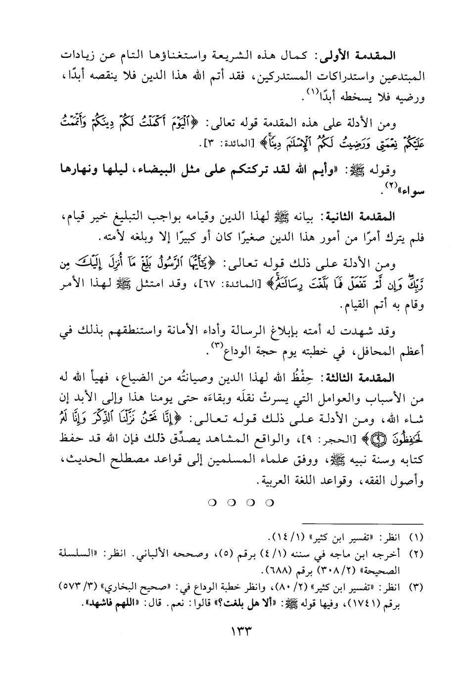 المقدمة الأولى: كمال هذه الشريعة واستغناؤها التام عن زيادات المبتدعين واستدراكات المستدركين، فقد أتم الله هذا الدين فلا ينقصه أبدًا، ورضيه فلا يسخطه أبدًا (1) .