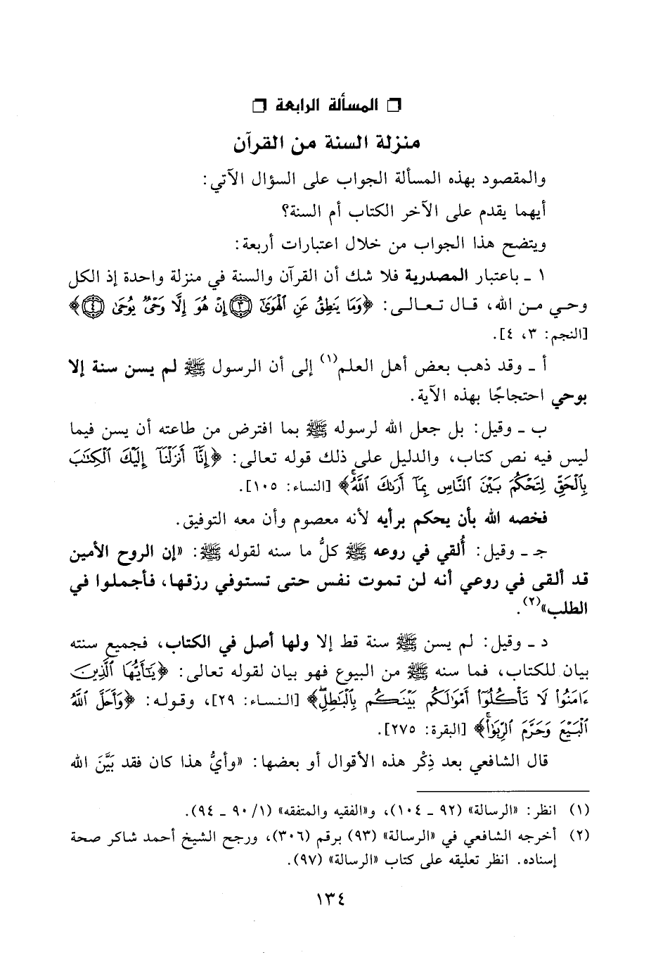 1- باعتبار المصدرية فلا شك أن القرآن والسنة في منزلة واحدة إذ الكل وحي من الله، قال تعالى: {وَمَا يَنْطِقُ عَنِ الْهَوَى* إِنْ هُوَ إِلا وَحْيٌ يُوحَى} [النجم: 3، 4] .