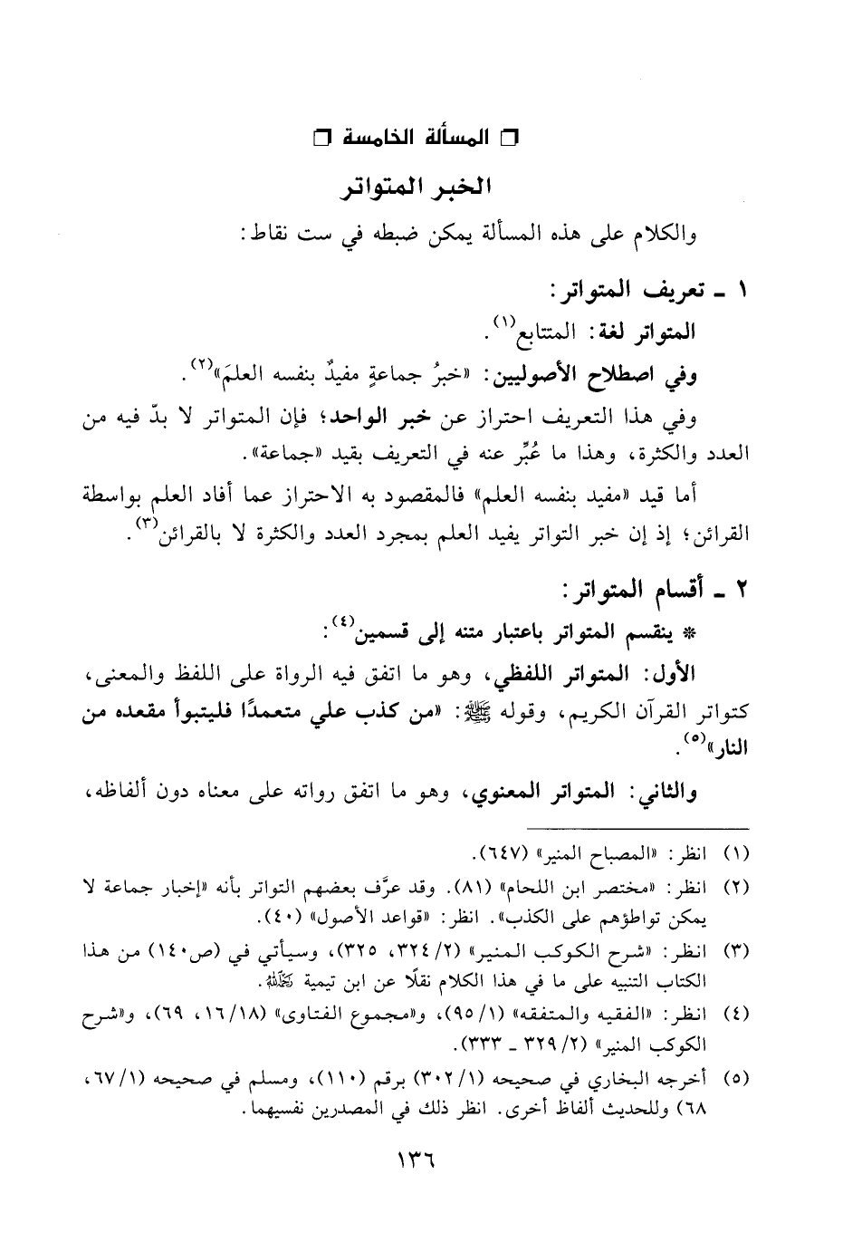 (2) انظر: "مختصر ابن اللحام" (81) . وقد عرف بعضهم التواتر بأنه "إخبار جماعة لا يمكن تواطؤهم على الكذب". انظر: "قواعد الأصول" (40) .