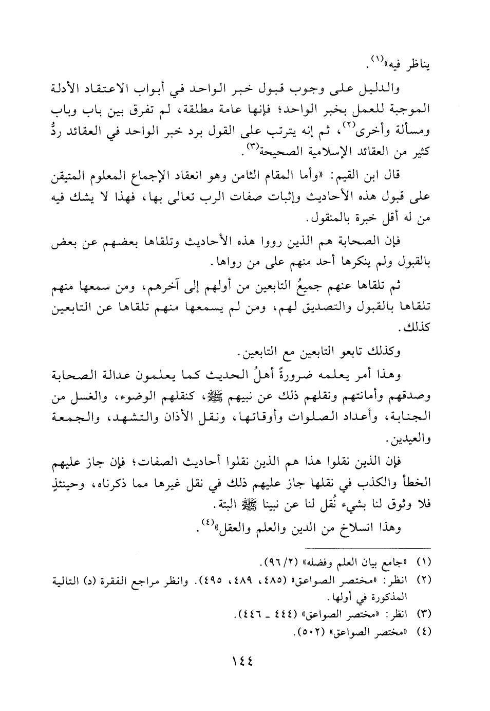قال ابن القيم: "وأما المقام الثامن وهو انعقاد الإجماع المعلوم المتيقن على قبول هذه الأحاديث وإثبات صفات الرب تعالى بها، فهذا لا يشك فيه من له أقل خبرة بالمنقول.