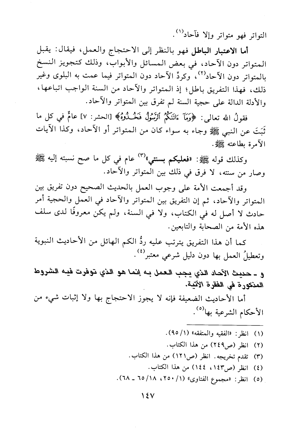 وكذلك قوله - صلى الله عليه وسلم -: «فعليكم بسنتي» (3) عام في كل ما صح نسبته إليه - صلى الله عليه وسلم - وصار من سنته، لا فرق في ذلك بين المتواتر والآحاد.