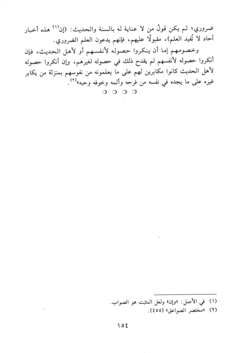 وخصومهم إما أن ينكروا حصوله لأنفسهم أو لأهل الحديث فإن أنكروا حصوله لأنفسهم لم يقدح ذلك في حصوله لغيرهم، وإن أنكروا حصوله لأنفسهم لم يقدح ذلك في حصوله لغيرهم، وإن أنكروا حصوله لأهل الحديث كانوا مكابرين لهم على ما يعلمونه من نفوسهم بمنزلة من يكابر غيره على ما يجده في نفسه من فرحه وألمه وخوفه وحبه" (2) .