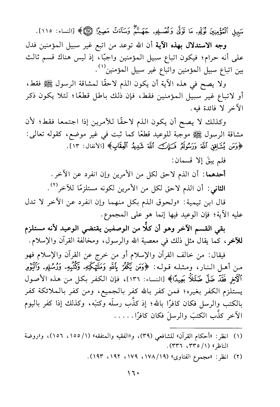 ولا يصح في هذه الآية أن يكون الذم لاحقًا لمشاقة الرسول - صلى الله عليه وسلم - فقط، أو لاتباع غير سبيل المؤمنين فقط، فإن ذلك باطل قطعًا؛ لئلا يكون ذكر الآخر لا فائدة فيه.