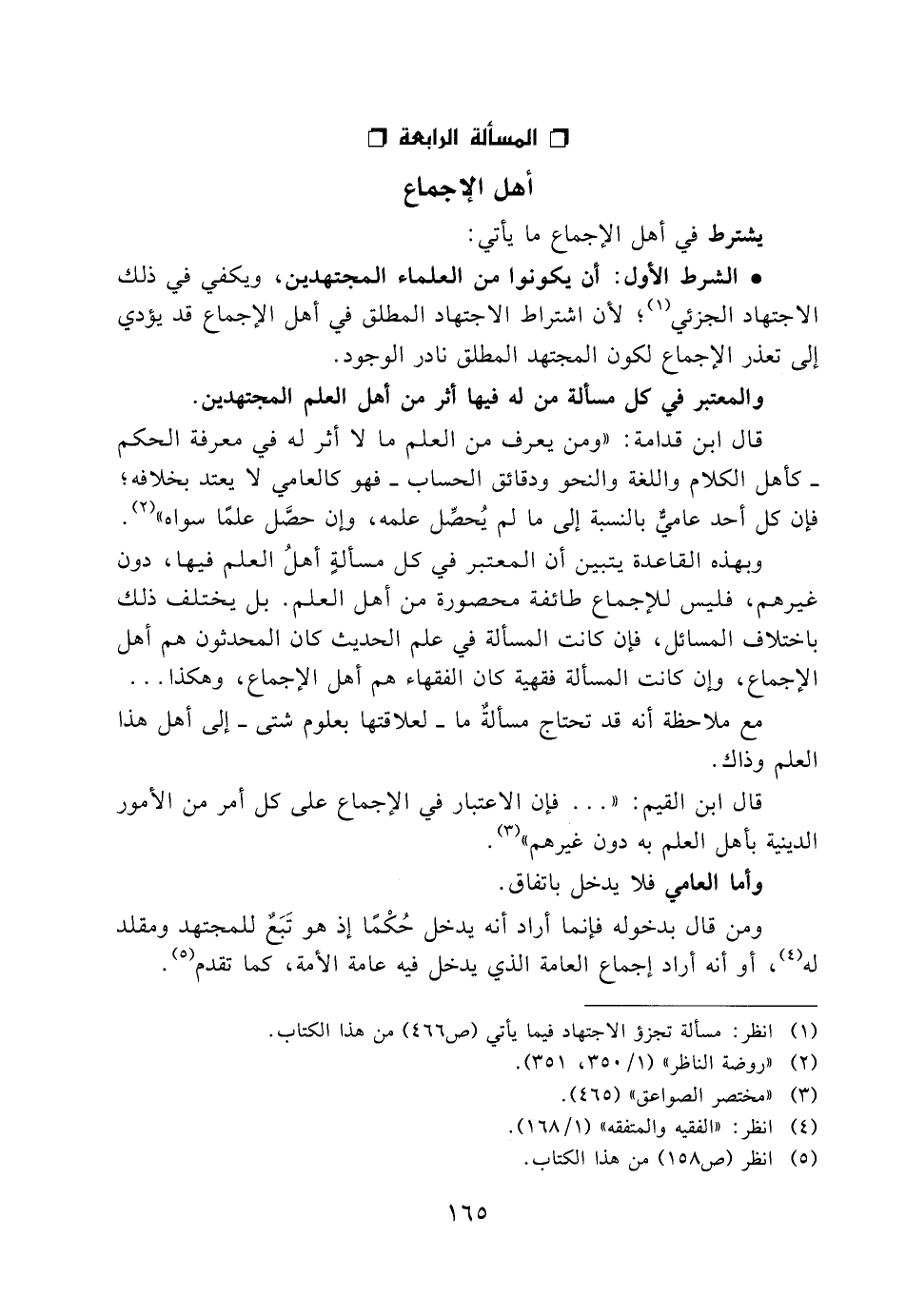 وبهذه القاعدة يتبين أن المعتبر في كل مسألةٍ أهلُ العلم فيها، دون غيرهم، فليس للإجماع طائفة محصورة من أهل العلم. بل يختلف ذلك باختلاف المسائل، فإن كانت المسألة في علم الحديث كان المحدثون هم أهل الإجماع، وإن كانت المسألة فقهية كان الفقهاء هم أهل الإجماع، وهكذا....