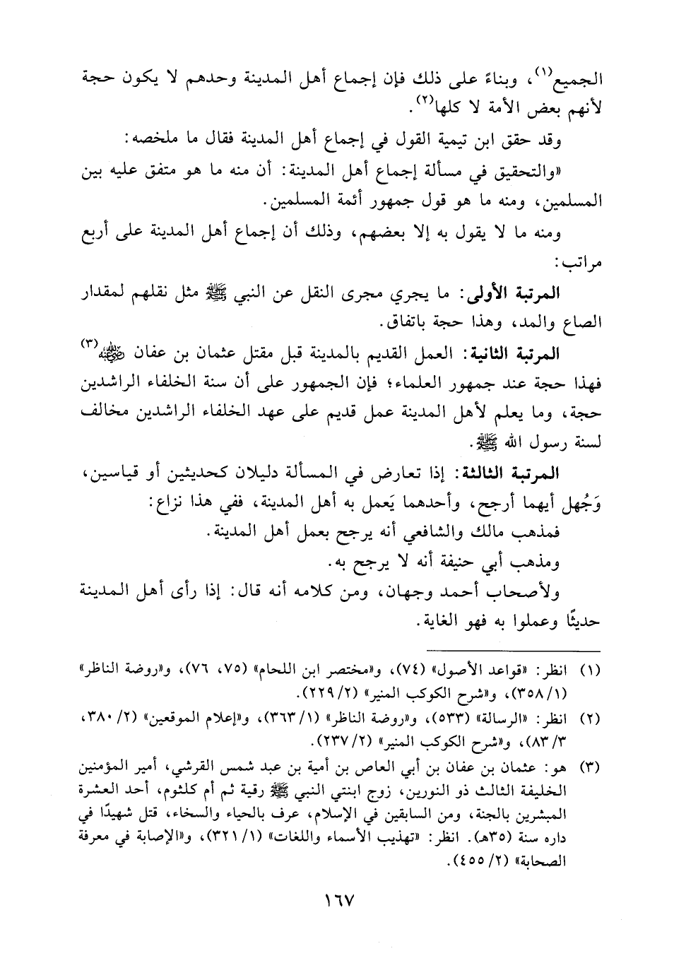 "والتحقيق في مسألة إجماع أهل المدينة: أن منه ما هو متفق عليه بين المسلمين، ومنه ما هو قول جمهور أئمة المسلمين.