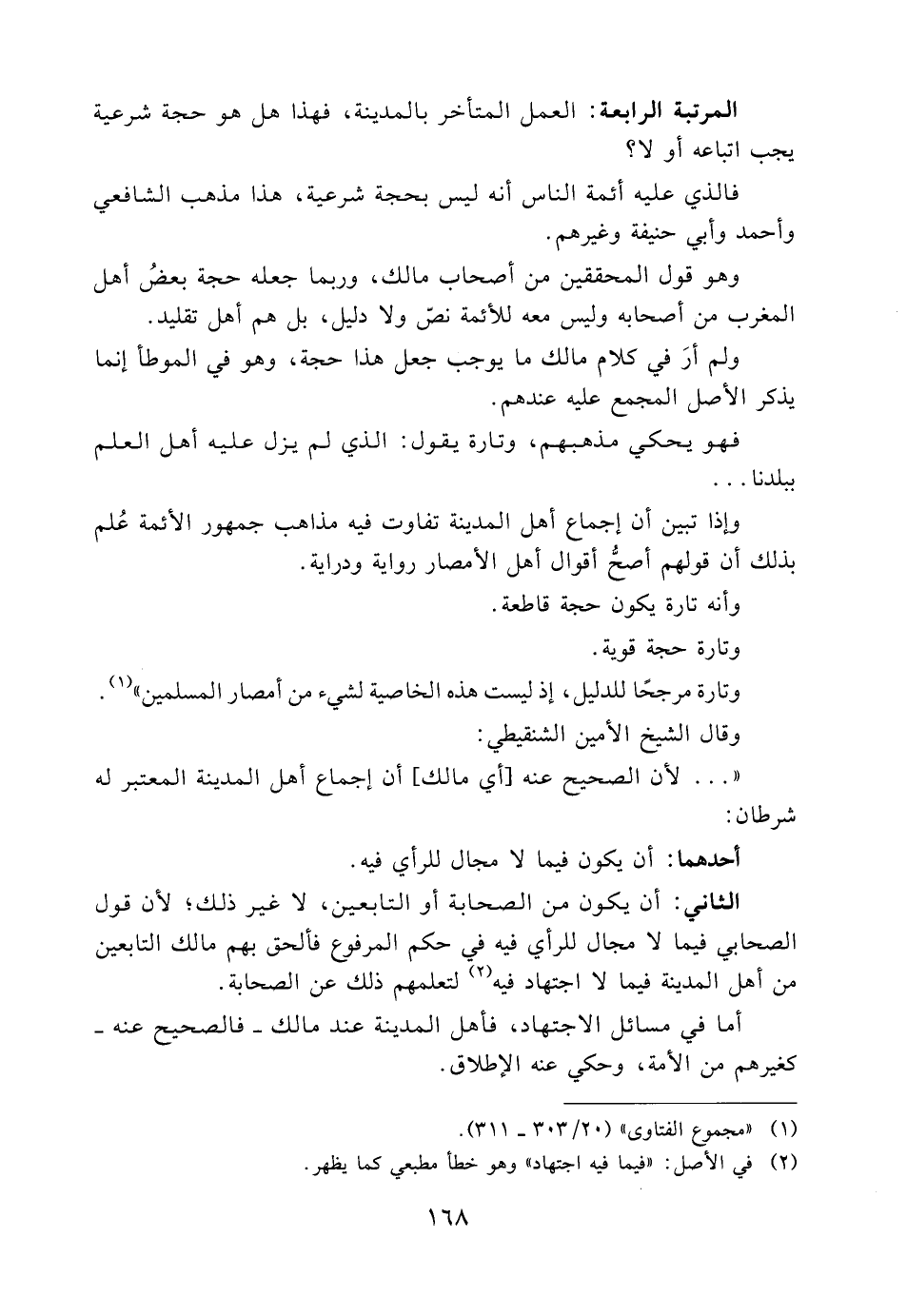 المرتبة الرابعة: العمل المتأخر بالمدينة، فهذا هل هو حجة شرعية يجب اتباعه أو لا؟