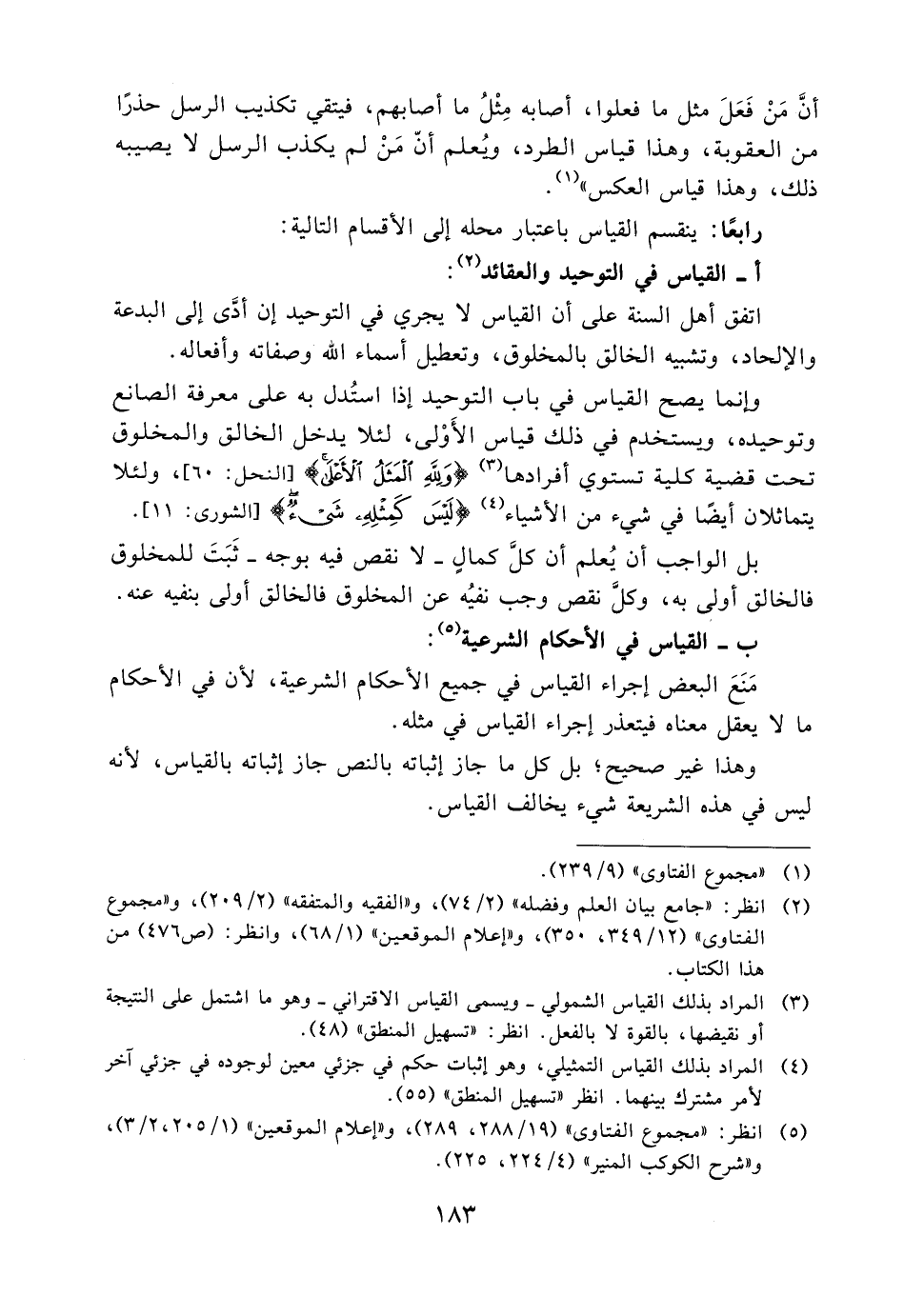 وإنما يصح القياس في باب التوحيد إذا استدل به على معرفة الصانع وتوحيده، ويستخدم في ذلك قياس الأولى، لئلا يدخل الخالق والمخلوق تحت قضية كلية تستوي أفرادها (3) {وَلِلَّهِ الْمَثَلُ الأعْلَى} [النحل: 60] ، ولئلا يتماثلان أيضًا في شيء من الأشياء (4) {لَيْسَ كَمِثْلِهِ شَيْءٌ} [الشورى: 11] .