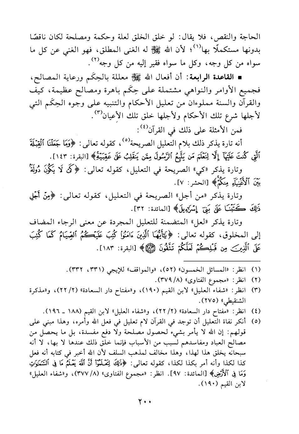 - القاعدة الرابعة: أن أفعال الله سبحانه وتعالى معللة بالحكم ورعاية المصالح، فجميع الأوامر والنواهي مشتملة على حكم باهرة ومصالح عظيمة، كيف والقرآن والسنة مملوءان من تعليل الأحكام والتنبيه على وجوه الحكم التي لأجلها شرع تلك الأحكام ولأجلها خلق تلك الأعيان (3) .