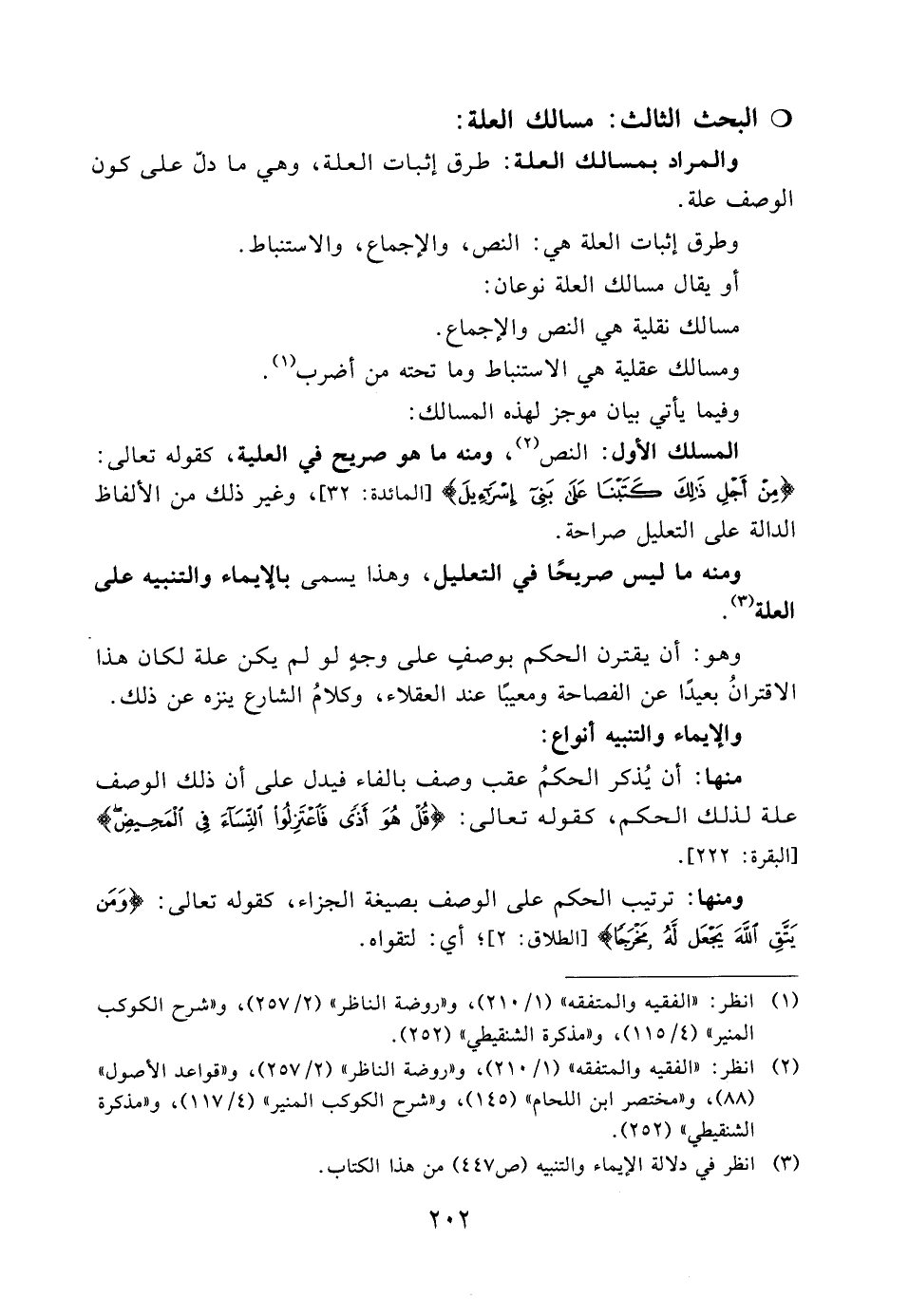 المسلك الأول: النص (2) ، ومنه ما هو صريح في العلية، كقوله تعالى: {مِنْ أَجْلِ ذَلِكَ كَتَبْنَا عَلَى بَنِي إِسْرَائِيلَ} [المائدة: 32] ، وغير ذلك من الألفاظ الدالة على التعليل صراحة.