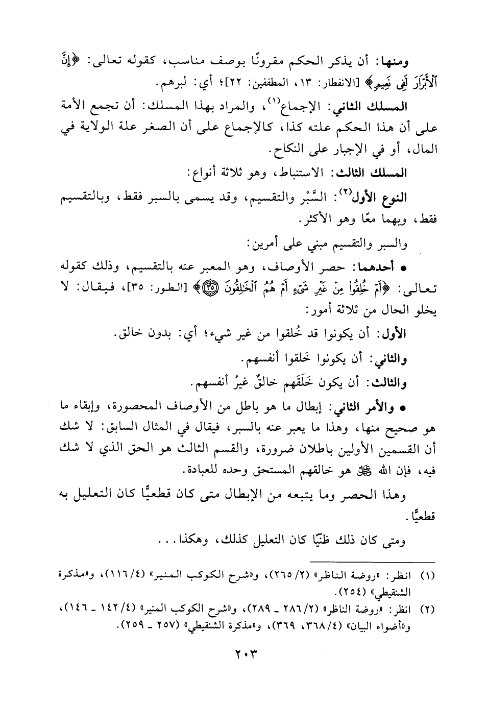 (والأمر الثاني: إبطال ما هو باطل من الأوصاف المحصورة، وإبقاء ما هو صحيح منها، وهذا ما يعبر عنه بالسبر، فيقال في المثال السابق: لا شك أن القسمين الأولين باطلان ضرورة، والقسم الثالث هو الحق الذي لا شك فيه، فإن الله عز وجل هو خالقهم المستحق وحده للعبادة.