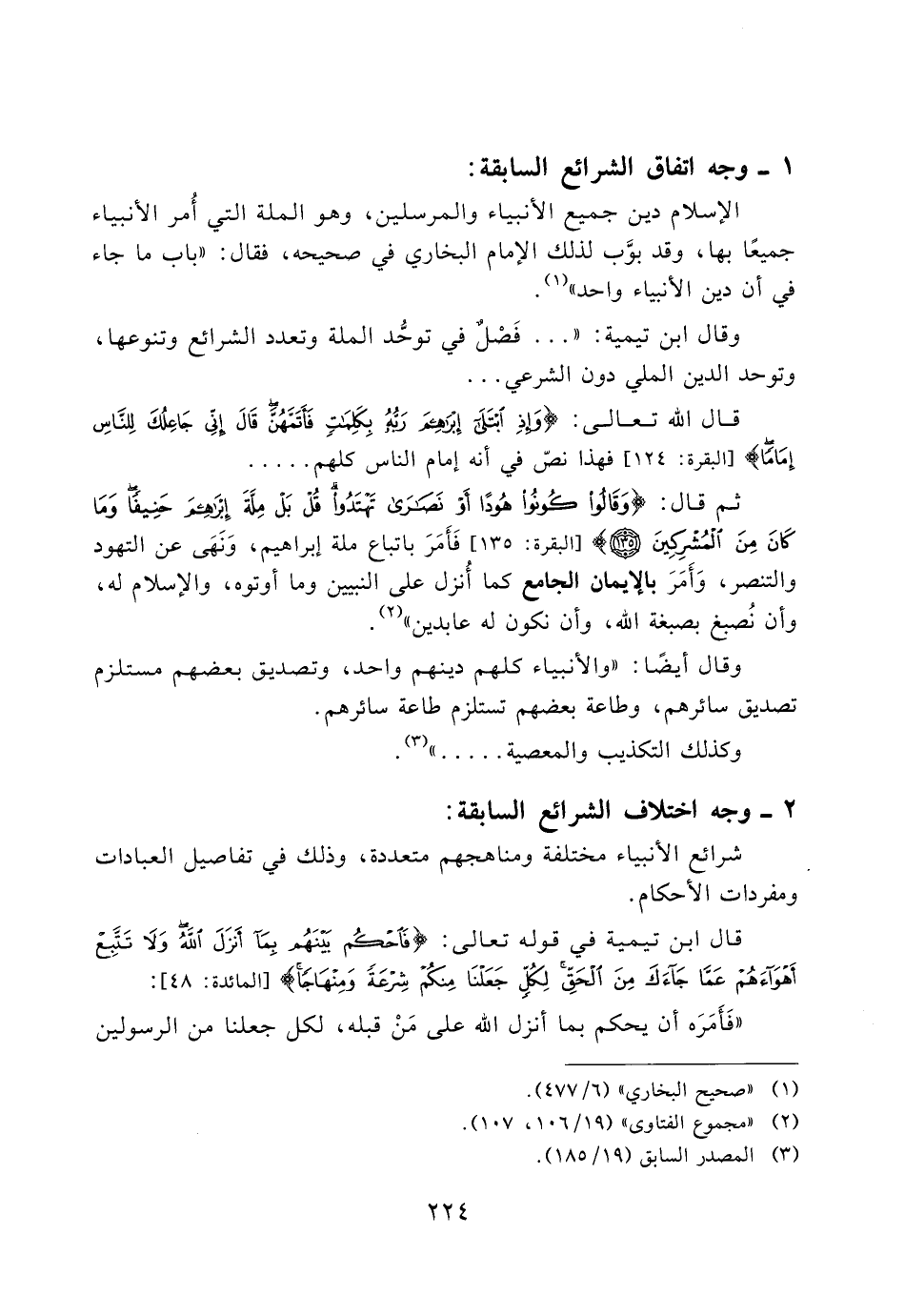 وقال ابن تيمية: ".........فصل في توحد الملة وتعدد الشرائع وتنوعها، وتوحد الدين الملي دون الشرعي....