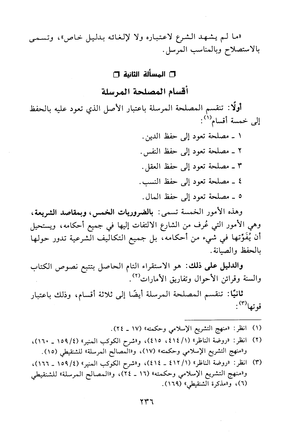 (3) انظر: "روضة الناظر" (1/412 - 414) ، و"المصالح المرسلة" للشنقيطي (6) ، و"مذكرة الشنقيطي" (169) ، "شرح الكوكب المنير" (4/ 159- 166) . "منهج التشريع الإسلامي وحكمته" (16- 24) .