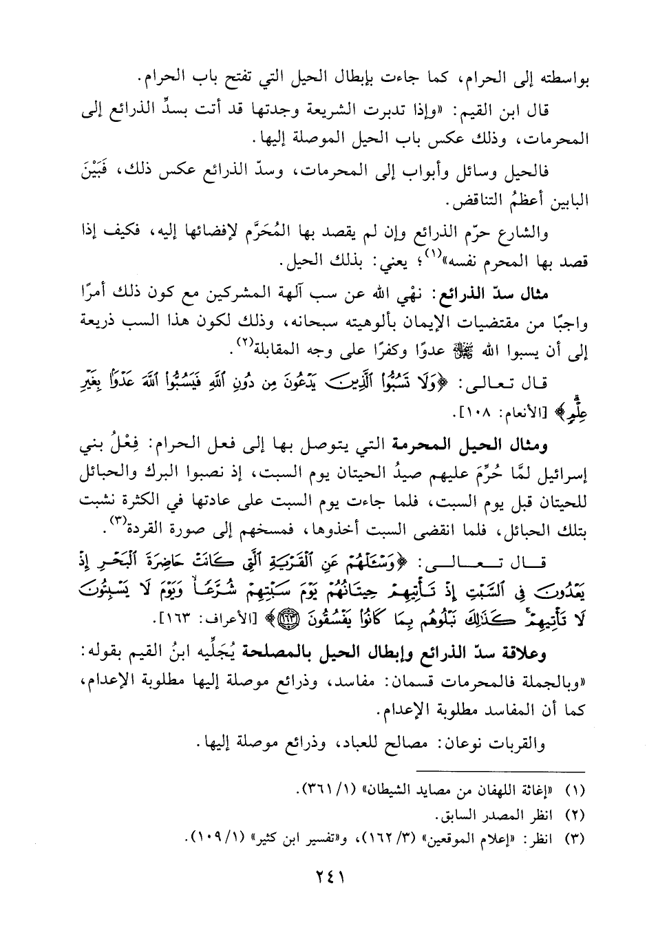 قال ابن القيم: " وإذا تدبرت الشريعة وجدتها قد أتت بسد الذرائع إلى المحرمات، وذلك عكس باب الحيل الموصلة إليها.