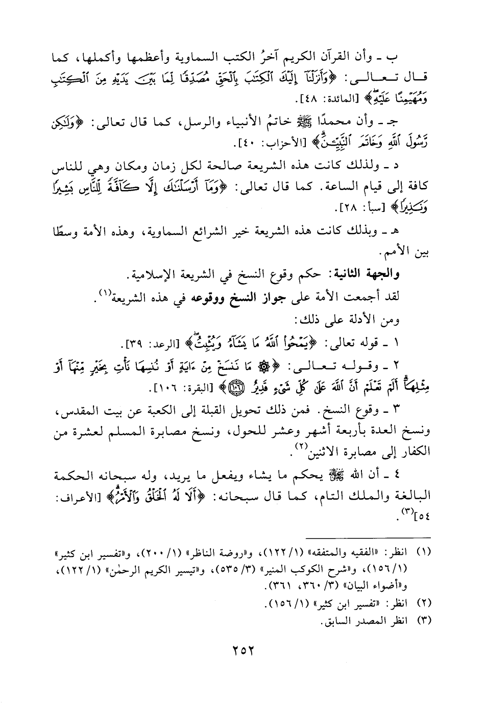 د- ولذلك كانت هذه الشريعة صالحة لكل زمان ومكان وهي للناس كافة إلى قيام الساعة. كما قال تعالى: {وَمَا أَرْسَلْنَاكَ إِلا كَافَّةً لِلنَّاسِ بَشِيرًا وَنَذِيرًا} [سبأ: 28] .