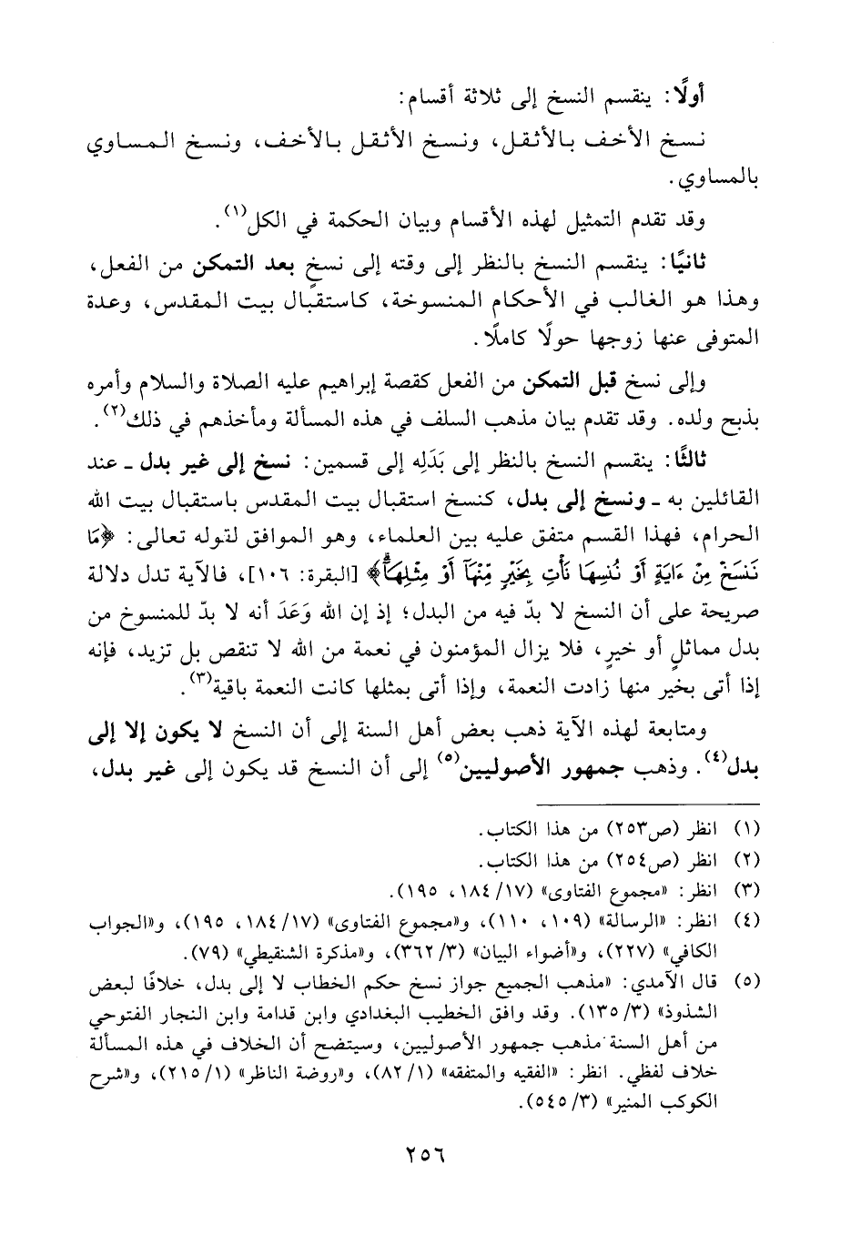 (5) قال الآمدي: "مذهب الجميع جواز نسخ حكم الخطاب لا إلى بدل، خلافًا لبعض الشذوذ" (3/135) . وقد وافق الخطيب البغدادي وابن قدامة وابن النجار الفتوحي من أهل السنة مذهب جمهور الأصوليين، وسيتضح أن الخلاف في هذه المسألة خلاف لفظي. انظر: "الفقيه والمتفقه" (1/82) ، و"روضة الناظر" (1/215) ، و"شرح الكوكب المنير" (3/545) .