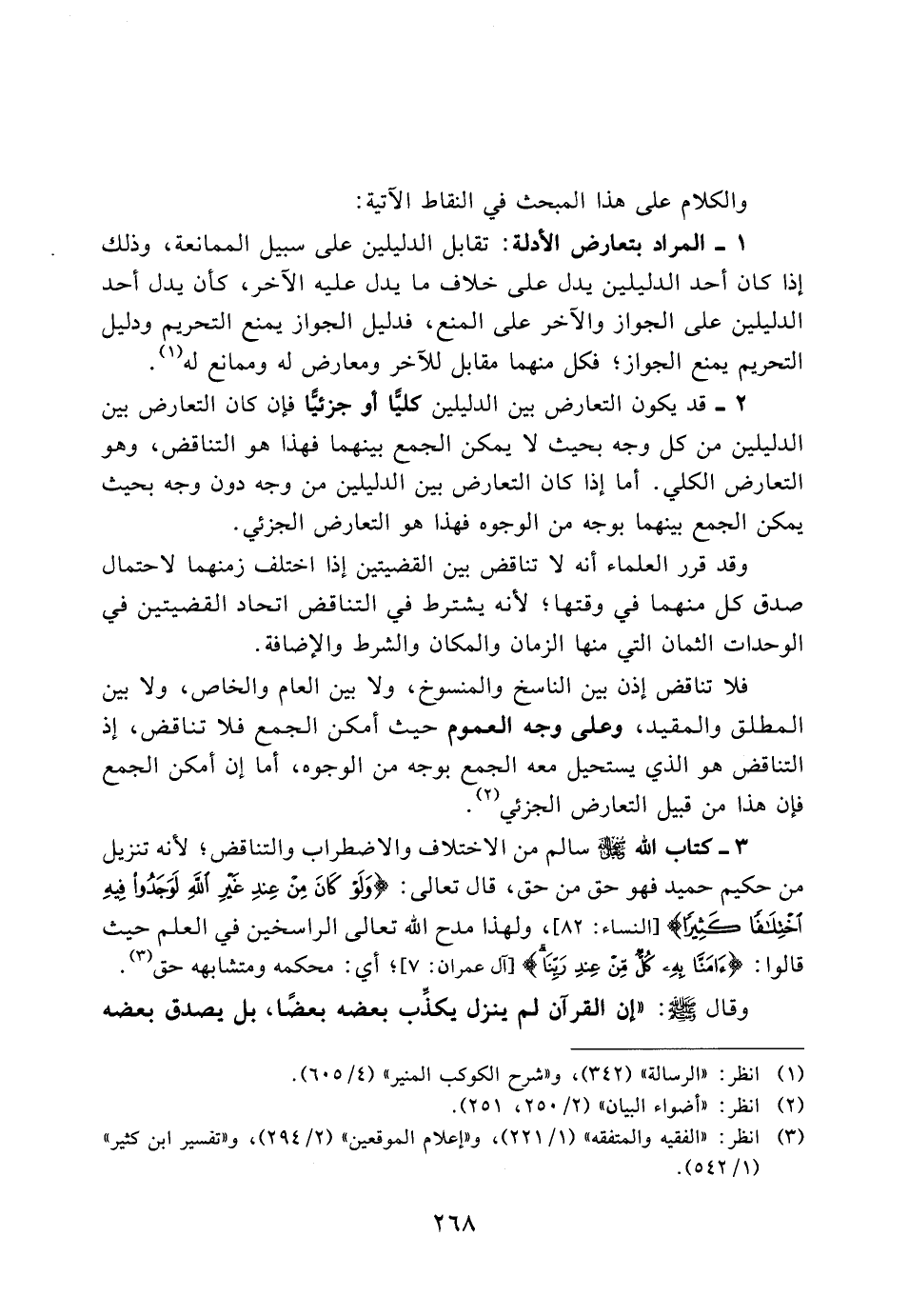 فلا تناقض إذن بين الناسخ والمنسوخ، ولا بين العام والخاص، ولا بين المطلق والمقيد، وعلى وجه العموم حيث أمكن الجمع فلا تناقض، إذ التناقض هو الذي يستحيل معه الجمع بوجه من الوجوه، أما إن أمكن الجمع فإن هذا من قبيل التعارض الجزئي (2) .