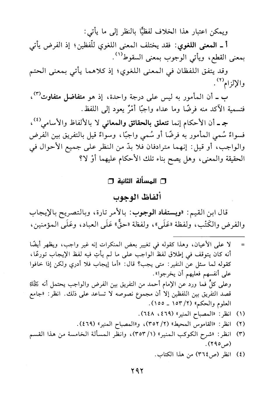 جـ- أن الأحكام إنما تتعلق بالحقائق والمعاني لا بالألفاظ والأسامي (4) ، فسواءٌ سُمي المأمور به فرضًا أو سُمي واجبًا، وسواءٌ قيل بالتفريق بين الفرض والواجب، أو قيل: إنهما مترادفان فلا بد من النظر على جميع الأحوال في الحقيقة والمعنى، وهل يصح بناء تلك الأحكام عليهما أوْ لا؟