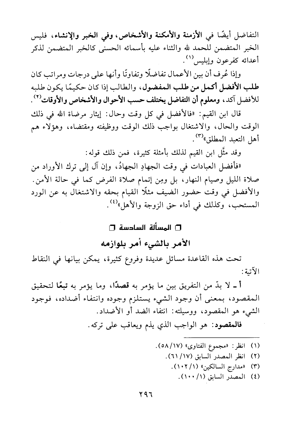 قال ابن القيم: "فالأفضل في كل وقت وحال: إيثار مرضاة الله في ذلك الوقت والحال، والاشتغال بواجب ذلك الوقت ووظيفته ومقتضاه، وهؤلاء هم أهل التعبد المطلق" (3) .