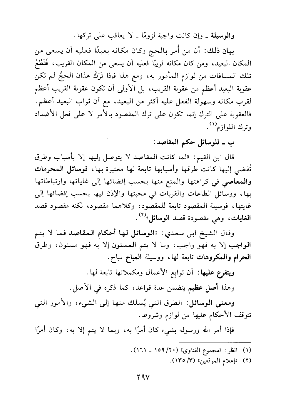 وقال الشيخ ابن سعدي: "الوسائل لها أحكام المقاصد فما لا يتم الواجب إلا به فهو واجب، وما لا يتم المسنون إلا به فهو مسنون، وطرق الحرام والمكروهات تابعة لها، ووسيلة المباح مباح.