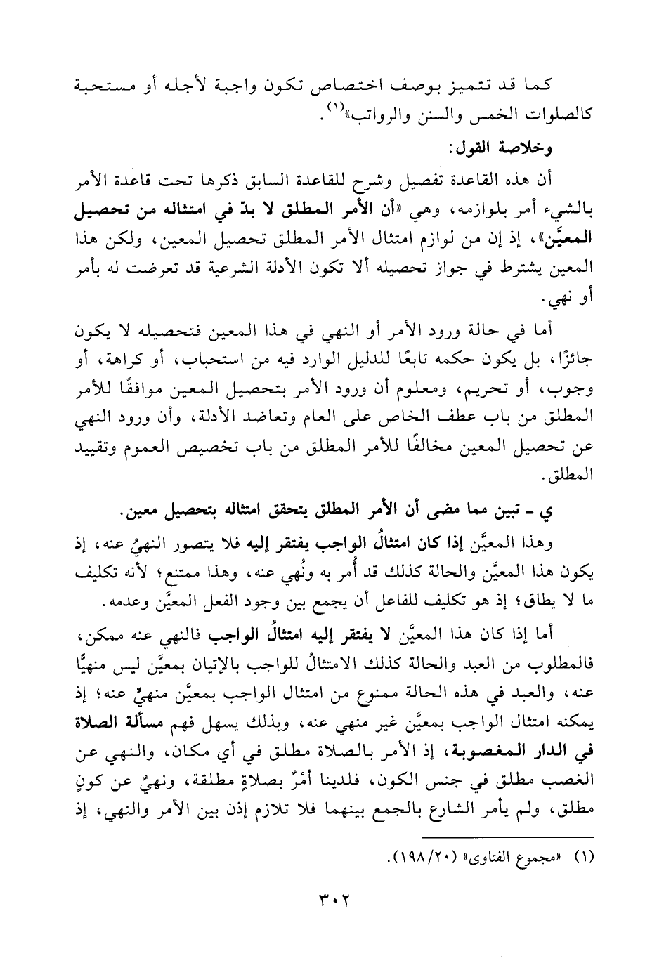 أما إذا كان هذا المعين لا يفتقر إليه امتثال الواجب فالنهي عنه ممكن، فالمطلوب من العبد والحالة كذلك الامتثالُ للواجب بالإتيان بمعين ليس منهيًا عنه، والعبد في هذه الحالة ممنوع من امتثال الواجب بمعين منهي عنه؛ إذ يمكنه امتثال الواجب بمعين غير منهي عنه، وبذلك يسهل فهم مسألة الصلاة في الدار المغصوبة، إذ الأمر بالصلاة مطلق في أي مكان، والنهي عن الغصب مطلق في جنس الكون، فلدينا أمر بصلاة مطلقة، ونهي عن كون مطلق، ولم يأمر الشارع