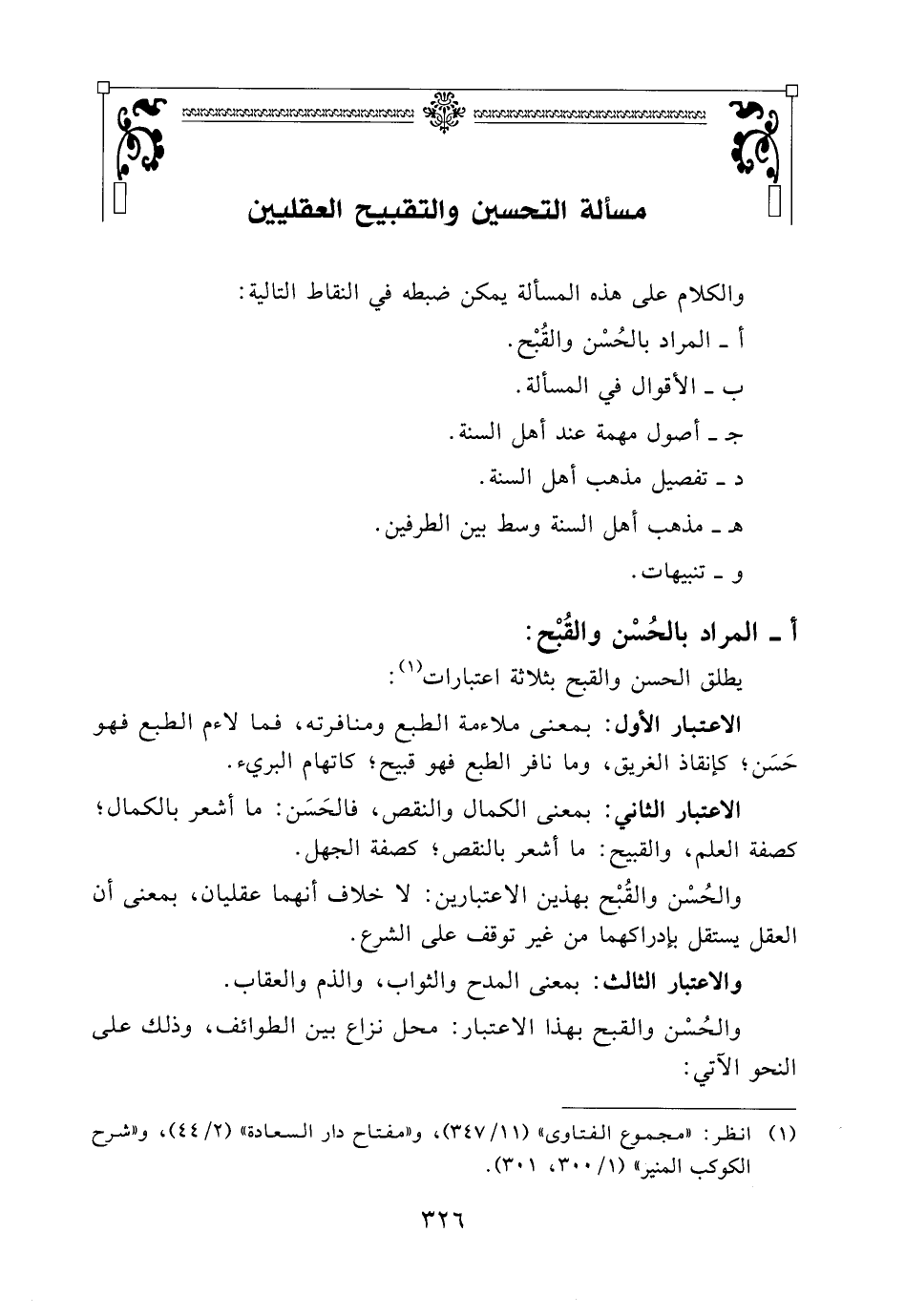 الاعتبار الثاني: بمعنى الكمال والنقص، فالحسن: ما أشعر بالكمال؛ كصفة العلم، والقبيح: ما أشعر بالنقص؛ كصفة الجهل.