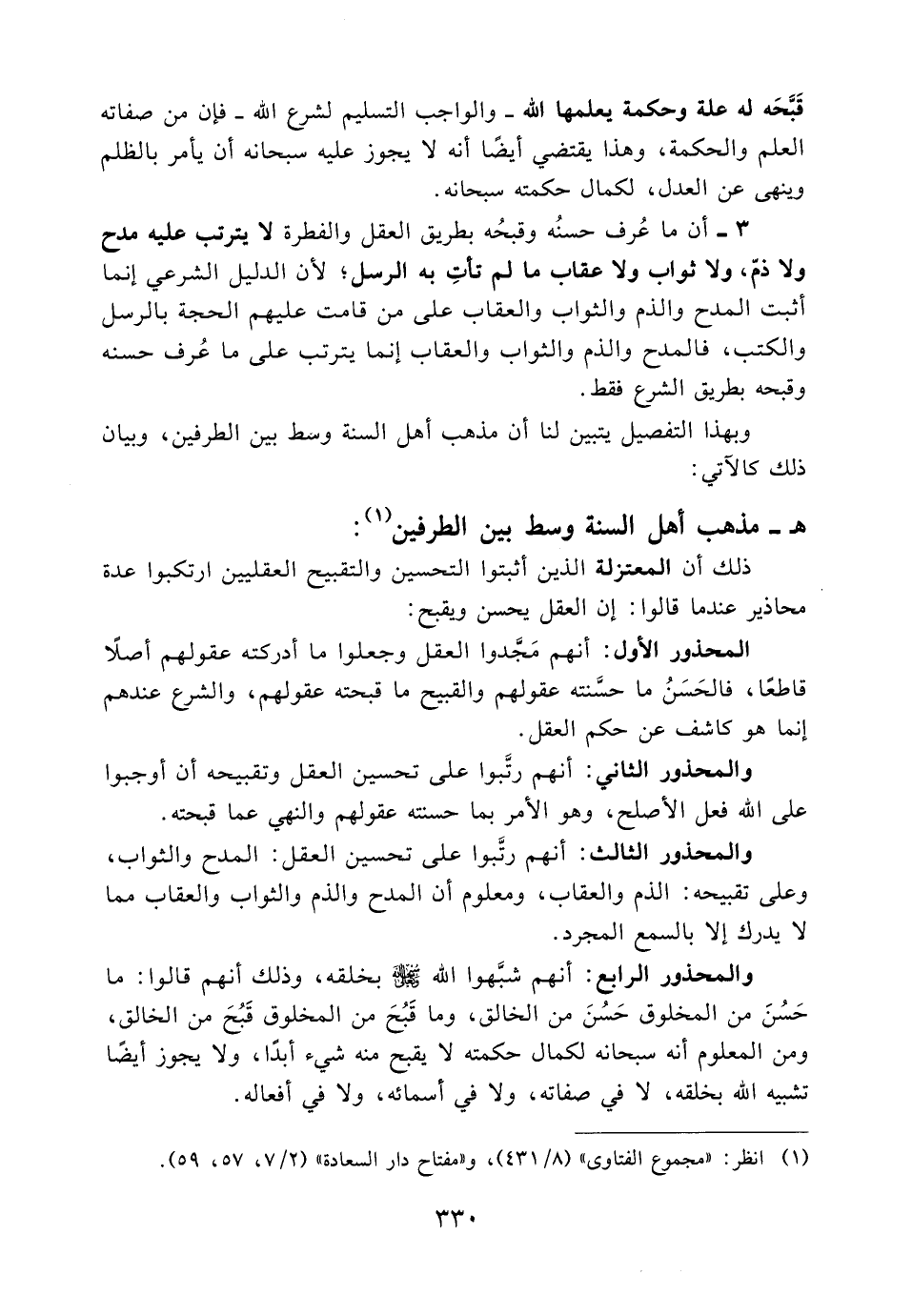 3- أن ما عُرف حسنُه وقبحُه بطريق العقل والفطرة لا يترتب عليه مدح ولا ذم، ولا ثواب ولا عقاب ما لم تأتِ به الرسل؛ لأن الدليل الشرعي إنما أثبت المدح والذم والثواب والعقاب على من قامت عليهم الحجة بالرسل والكتب، فالمدح والذم والثواب والعقاب إنما يترتب على ما عُرف حسنه وقبحه بطريق الشرع فقط.