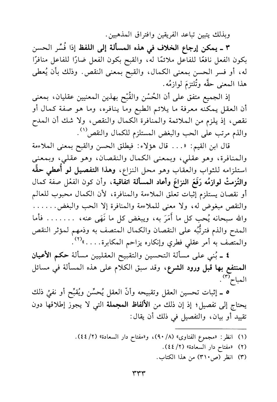 3- يمكن إرجاع الخلاف في هذه المسألة إلى اللفظ إذا فسر الحسن بكون الفعل نافعًا للفاعل ملائمًا له، والقبح بكون الفعل ضارًا للفاعل منافرًا له، أو فسر الحسن بمعنى الكمال، والقبح بمعنى النقص. وذلك بأن يُعطى هذا المعنى حقه وتلتزم لوازمه.
