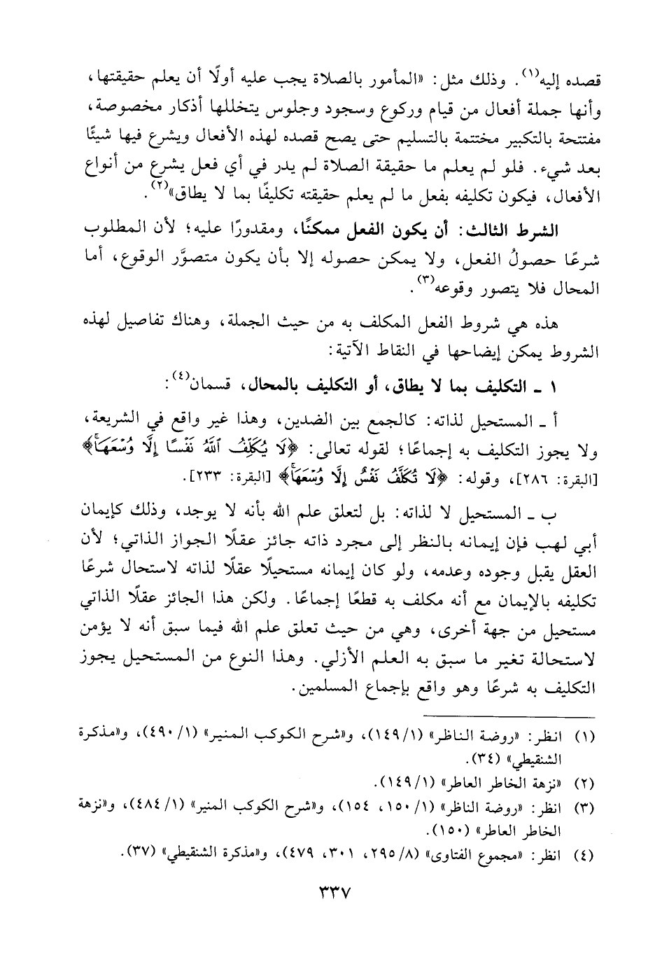 الشرط الثالث: أن يكون الفعل ممكنًا، ومقدورًا عليه؛ لأن المطلوب شرعًا حصولُ الفعل، ولا يمكن حصوله إلا بأن يكون متصور الوقوع، أما المحال فلا يتصور وقوعه (3) .