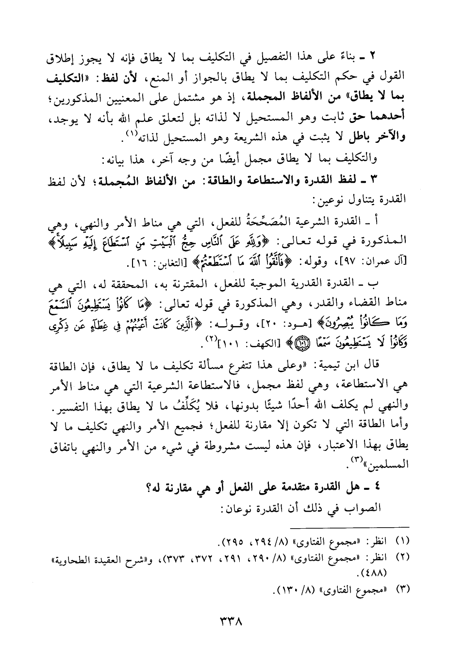 قال ابن تيمية: "وعلى هذا تتفرع مسألة تكليف ما لا يطاق، فإن الطاقة هي الاستطاعة، وهي لفظ مجمل، فالاستطاعة الشرعية التي هي مناط الأمر والنهي لم يكلف الله أحدًا شيئًا بدونها، فلا يكلف ما لا يطاق بهذا التفسير. وأما الطاقة التي لا تكون إلا مقارنة للفعل؛ فجميع الأمر والنهي تكليف ما لا يطاق بهذا الاعتبار، فإن هذه ليست مشروطة في شيء من الأمر والنهي باتفاق المسلمين" (3) .